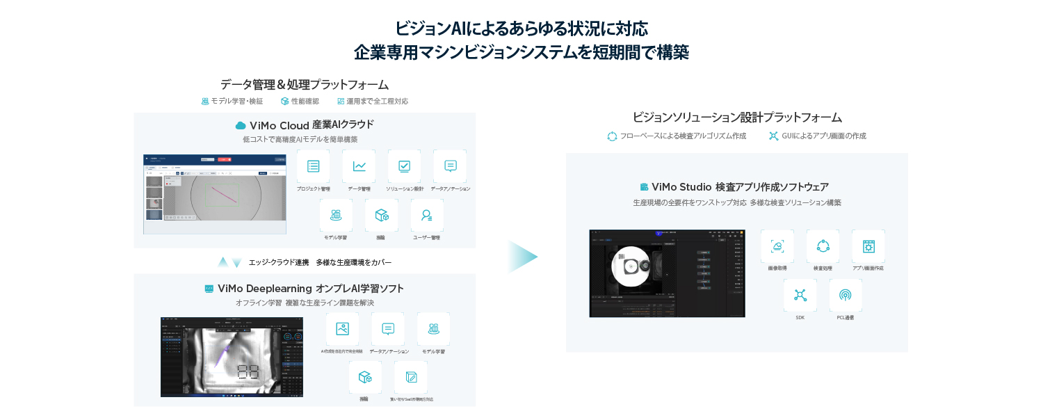 Smore ViMoは、データ管理、ビジュアルソリューション設計、エンドツーエンドのソフトウェアなどを提供し、業界のビジュアルニーズを満たすことができます。工場は、アルゴリズム開発を担当する専任者がいなくても、モデルトレーニング、ソフトウェア統合、生産ラインの導入を速やかに実施することができ、製造業におけるインテリジェントアプリケーションのハードルを大きく引き下げ、また包括的でスマートな機能を提供します。Smore ViMoシリーズには現在、ViMo Cloud、ViMo Deeplearning、ViMo Studioが含まれています。